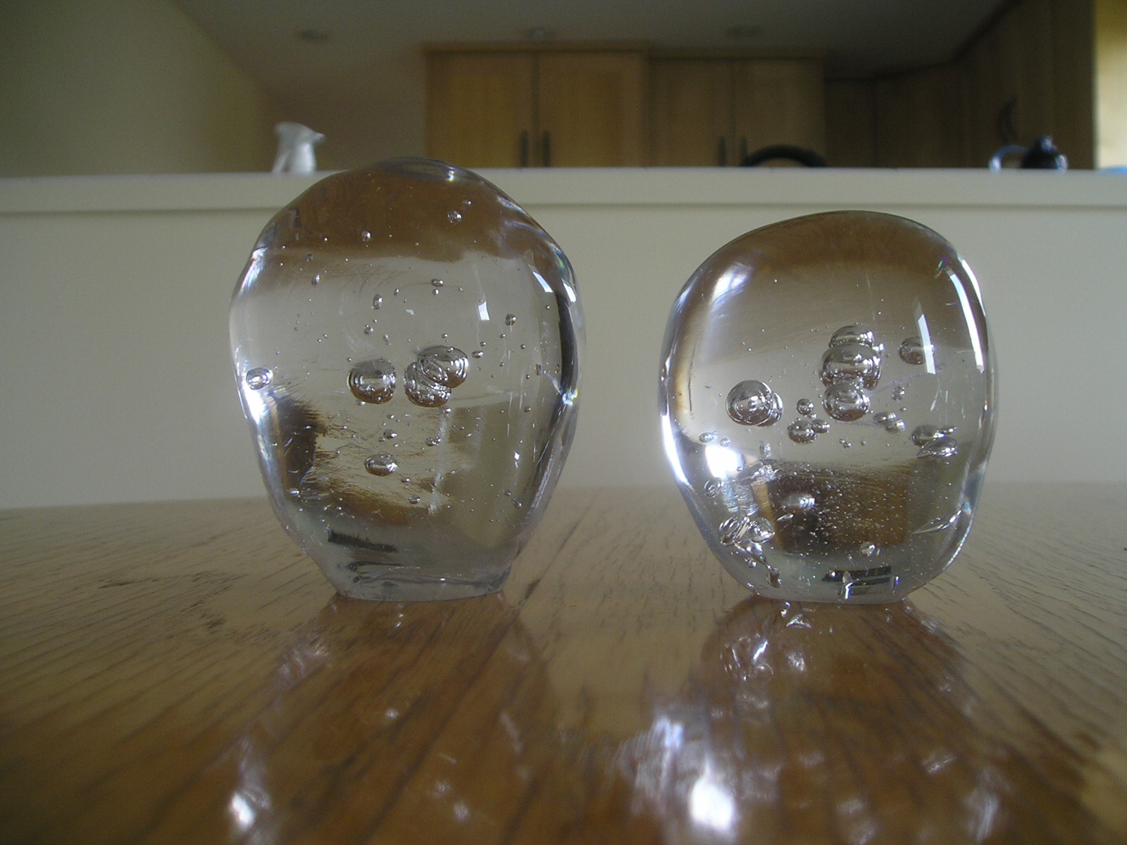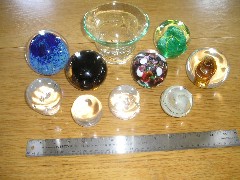There's only one photo from the April session; the rest are from June. During the June one, I suddenly got it. I felt in control, and produced much nicer shapes. Spherical is still hard, but towards the end I'm getting to the point where you have to look carefully to see where they are not spherical. With some, the coloured glass inside is way off centre.