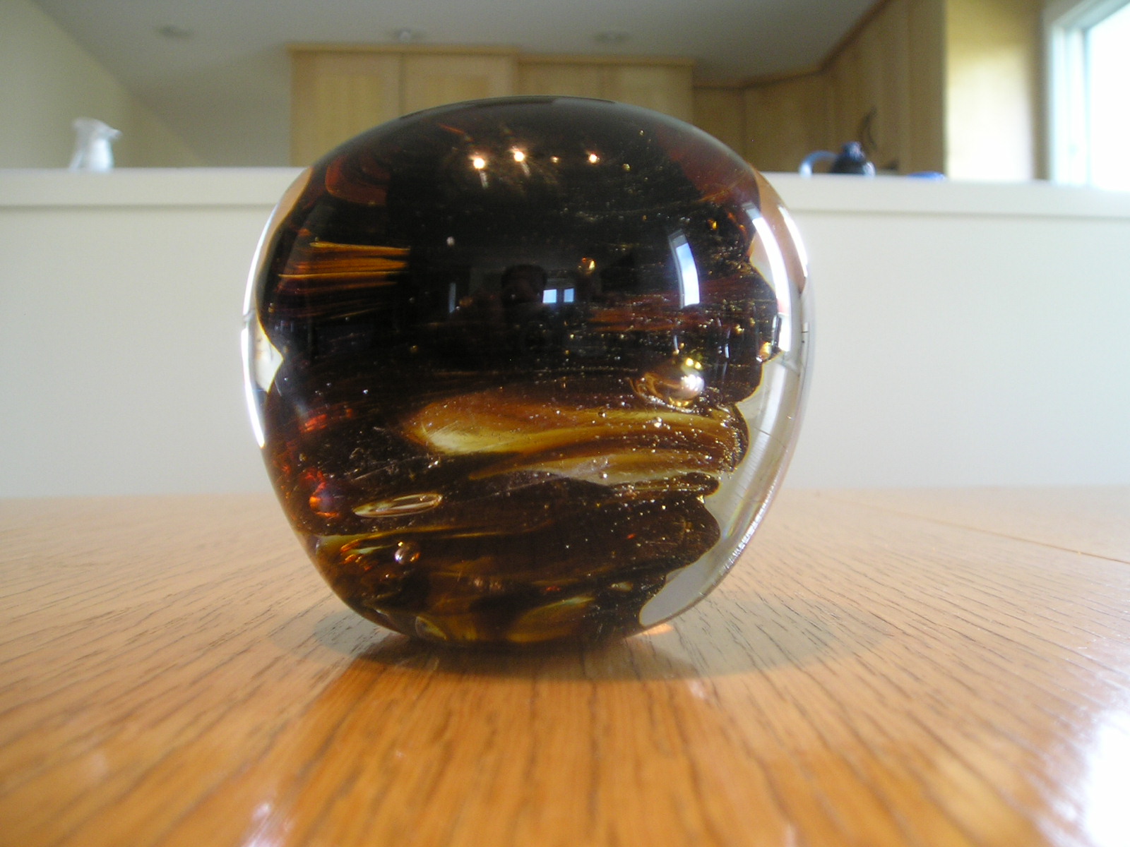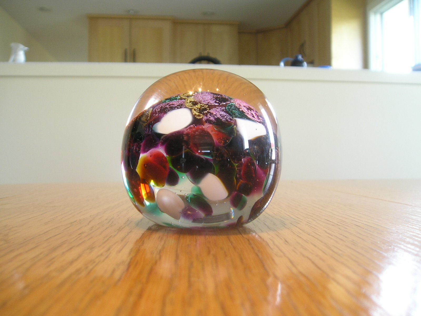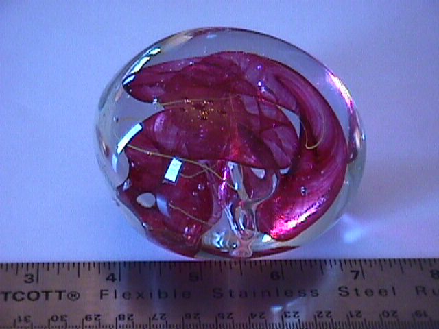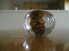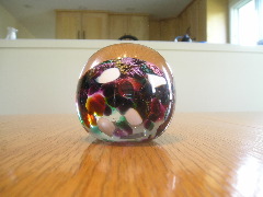 These photos were taken with a fairly new digital camera but it's no easier now than it was when I took the first batch way back when. You get all the reflections, and it's hard to see the interior detail. Lots of shots were ruined when the flash insisted on going off. That creates a bright spot on the paperweight. If anyone has hints on how to get a good photograph of spherical glass objects please pass them along. I really should study the manual that came with the camera. Maybe there some things I could do to get better pictures.