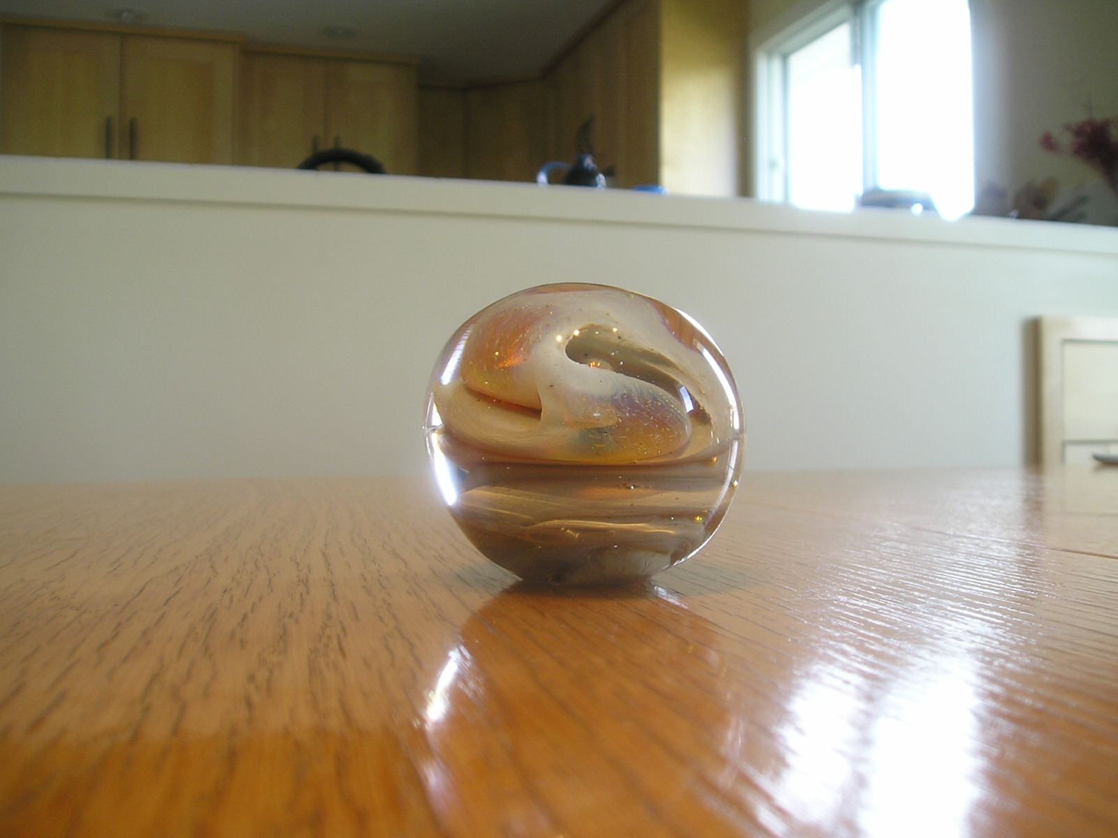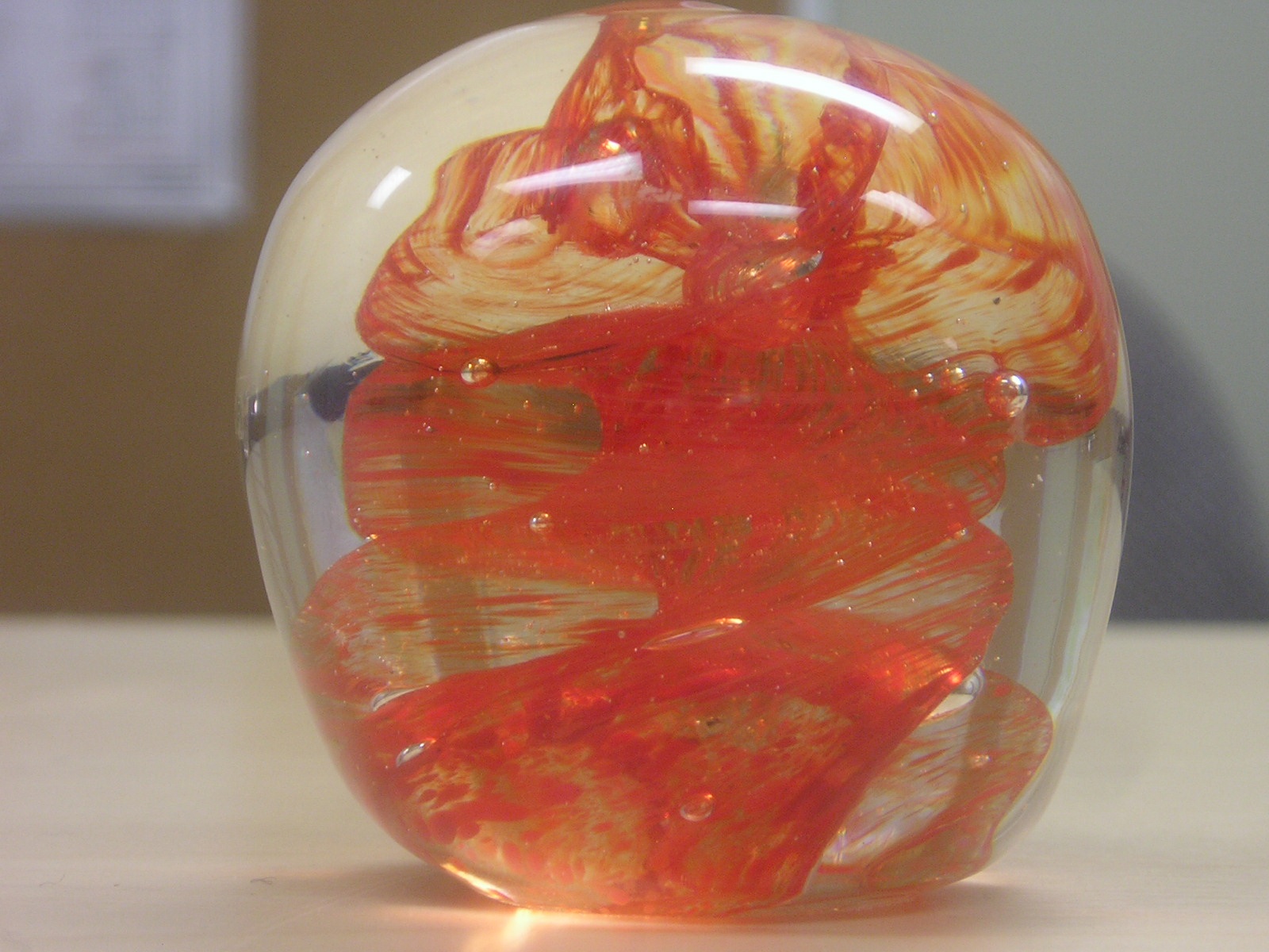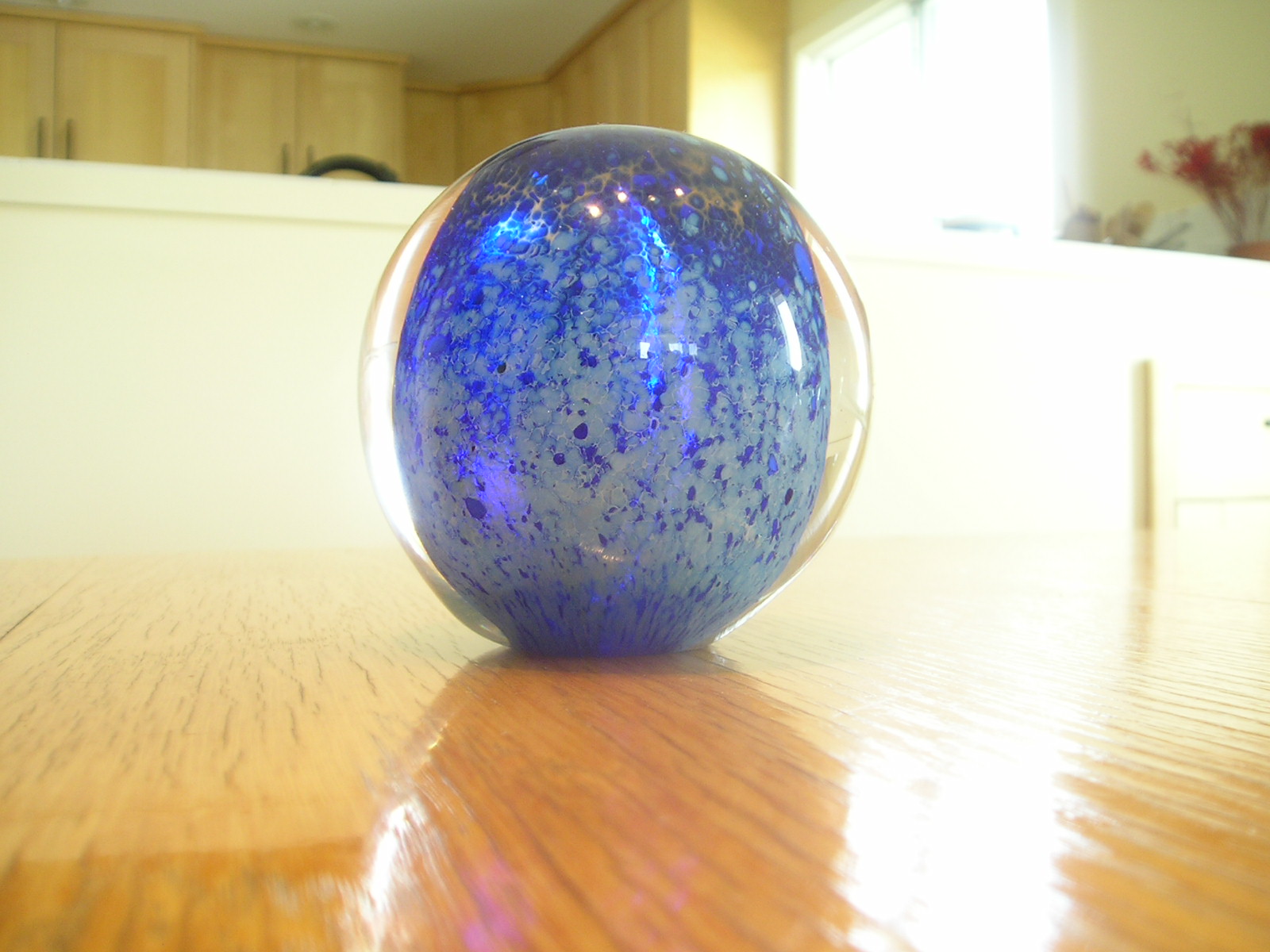 These photos were taken with a fairly new digital camera but it's no easier now than it was when I took the first batch way back when. You get all the reflections, and it's hard to see the interior detail. Lots of shots were ruined when the flash insisted on going off. That creates a bright spot on the paperweight. If anyone has hints on how to get a good photograph of spherical glass objects please pass them along. I really should study the manual that came with the camera. Maybe there some things I could do to get better pictures.