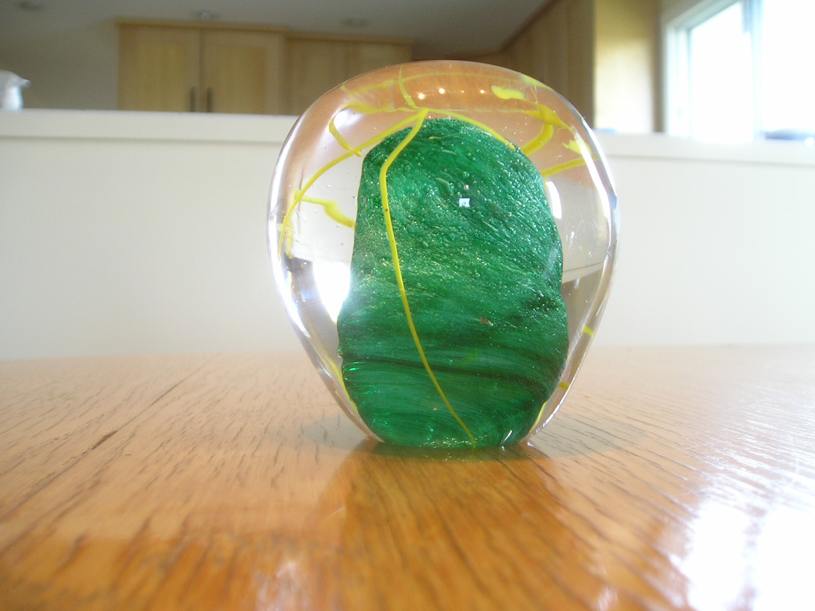 I wanted to blow a cereal bowl, and ended up with a fruit bowl. I was mostly in control, but blew it up just a bit too much too soon, and ended up with the base being a bit thin, so Barry rescued it by putting on more glass as a base. Then I worked on the shape. It's nicely round, but if you look carefully, you can see lots of scratches from the jacks. The rim really is a faint green; it's not just a reflection from the green in the paperweight.